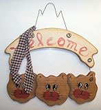 CHECK LOWEST PRICES , BEST DISCOUNT and COMPARE PARE PRICES ABOUT "ABC Products" - Primitive Style ~ Wood - 3 Cat Heads on a Wire Hanger - with Welcome Sign (Handmade and Painted in USA - Homespun Fabric Accent).